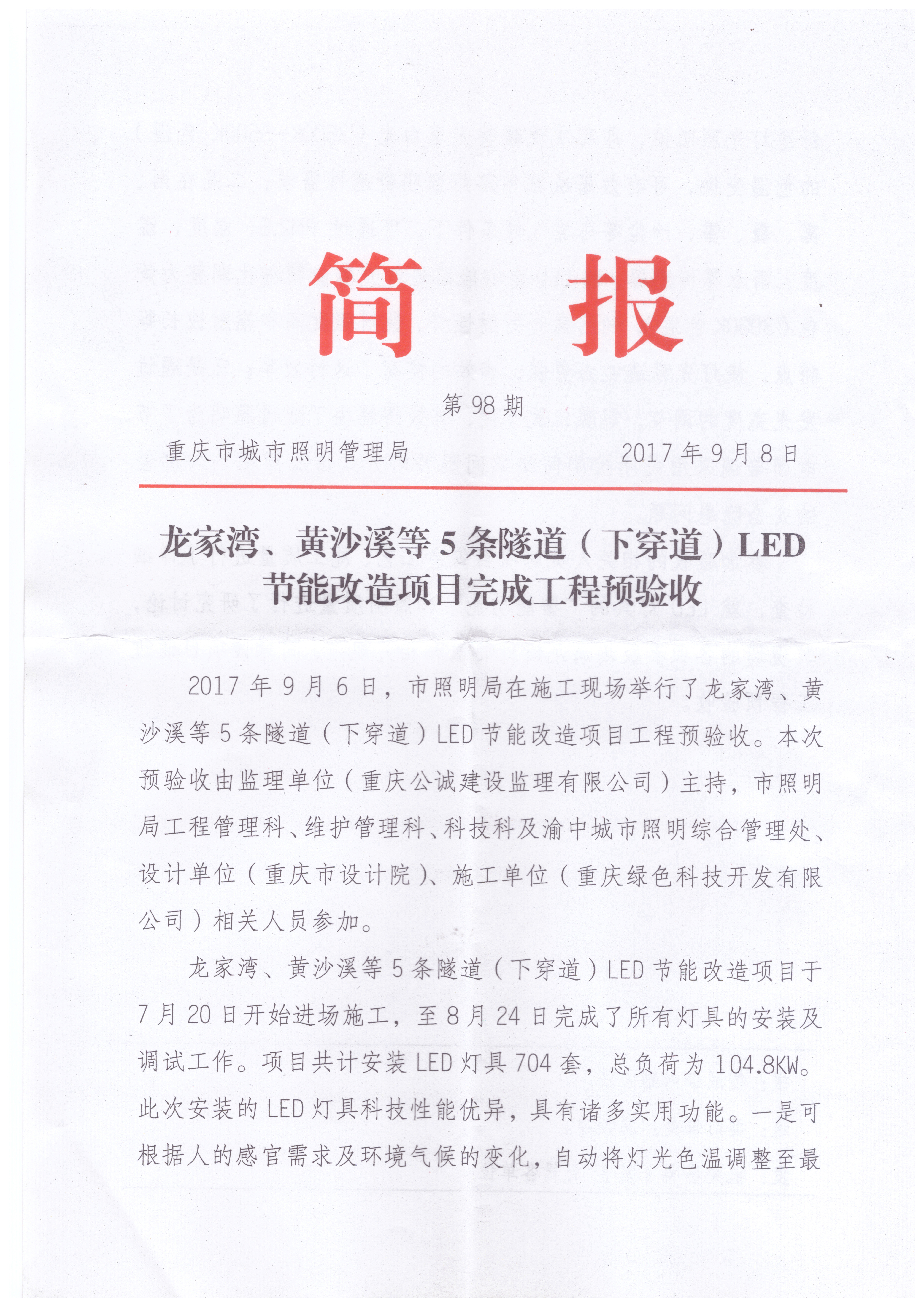 2017年7月31日,我司使用“中國創造”“互聯網+”多色溫防霧霾LED全智能路燈在重慶市龍家灣、黃沙溪、袁家崗、鵝嶺、陳家坪隧道實施科技節能改造工程已全面竣工。2017年9月6日,該項目建設單位重慶市城市照明管理局、監理公司及設計公司對該項目進行了現場預驗收,參會人員對該創新專利產品作出了極高的評價。會后,重慶市城市照明管理局專門印發了《龍家灣、黃沙溪等5條隧道(下穿道)LED節能改造項目完成工程預驗收》簡報(附后),其上級主管部門重慶市城市管理委員會對其進行了新聞報道。